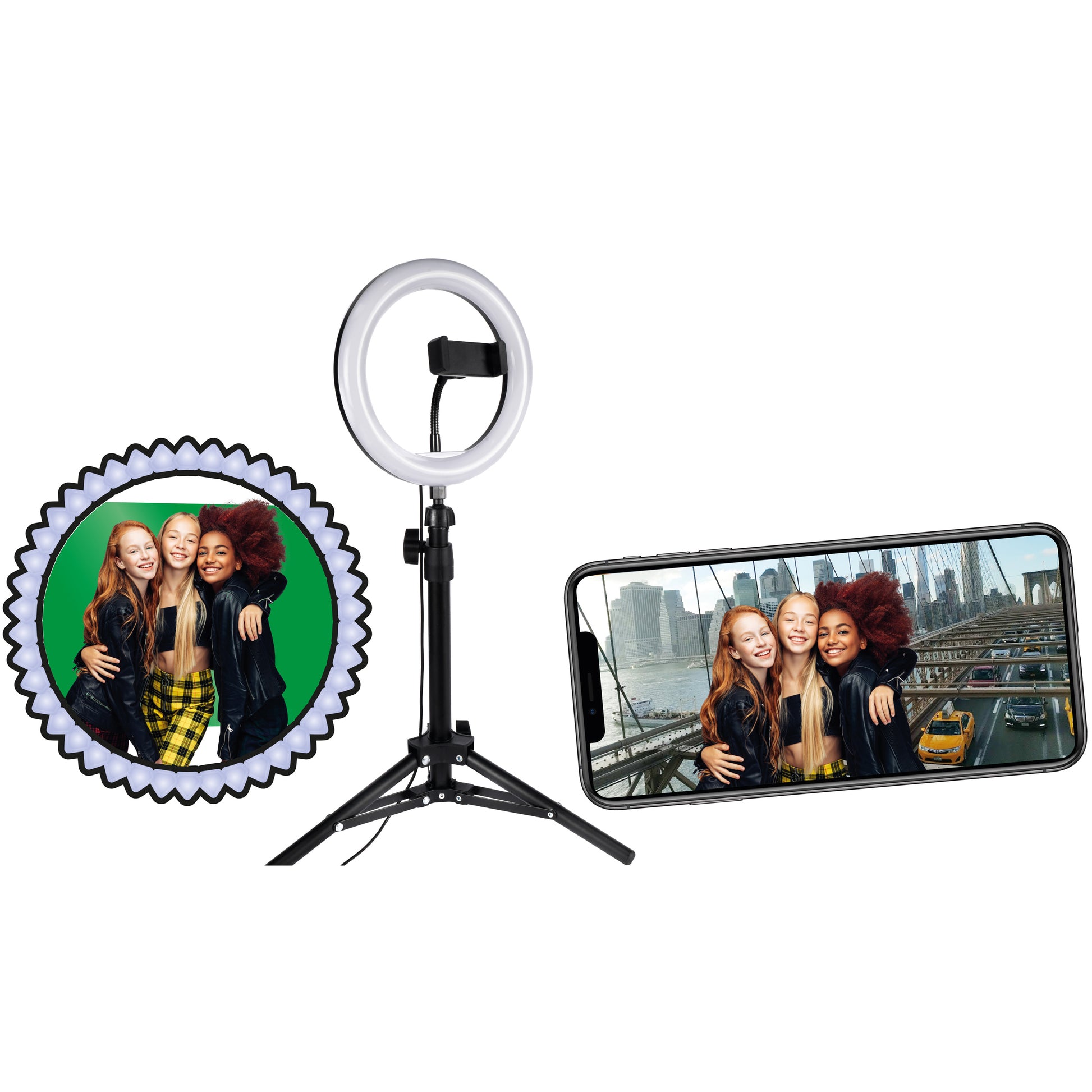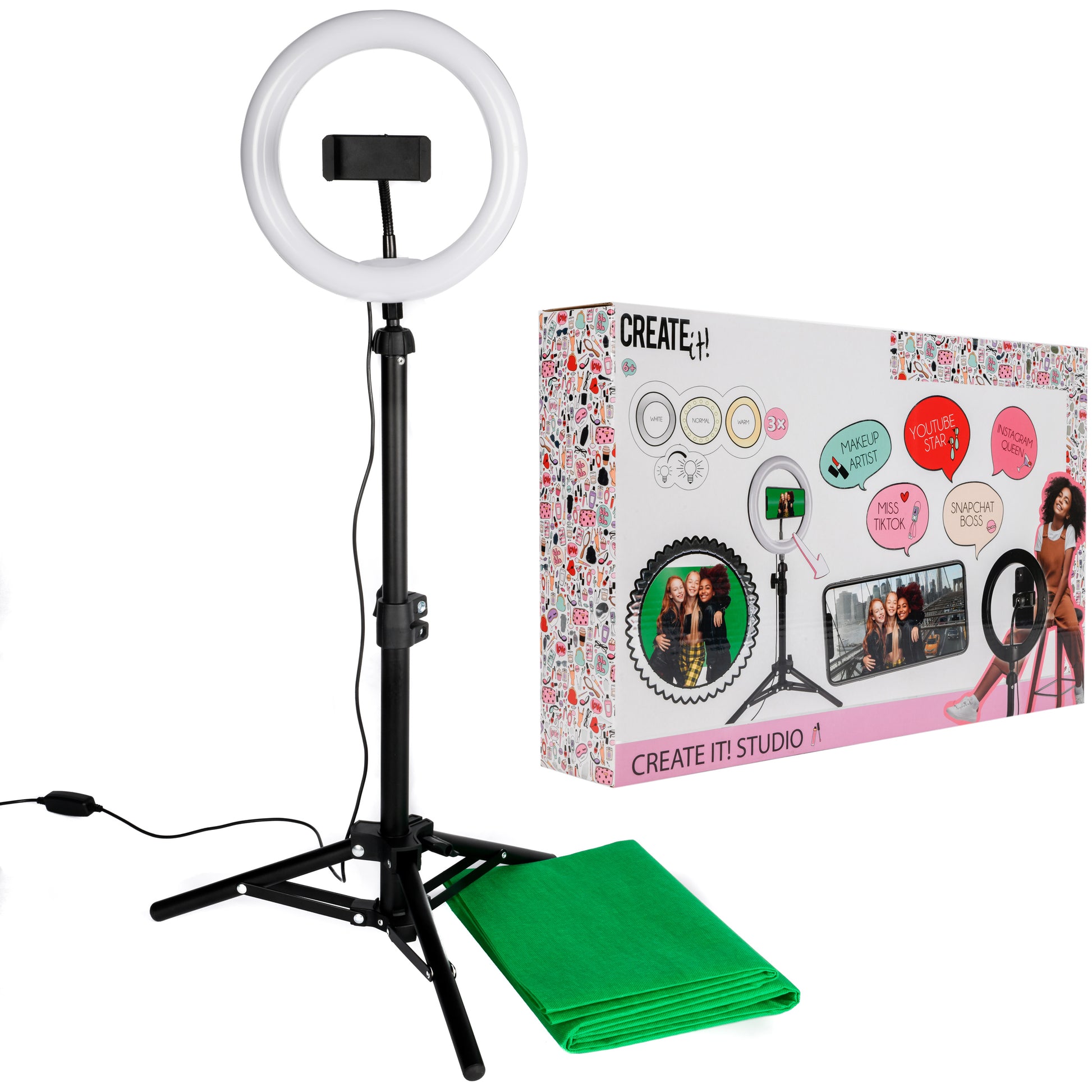 Deze Create It! Studio Ringlight set bevat een driepootstatief, ringlamp (20cm) en een green screen. Maak professionele shoots voor al jouw social media kanalen met de juiste belichting.