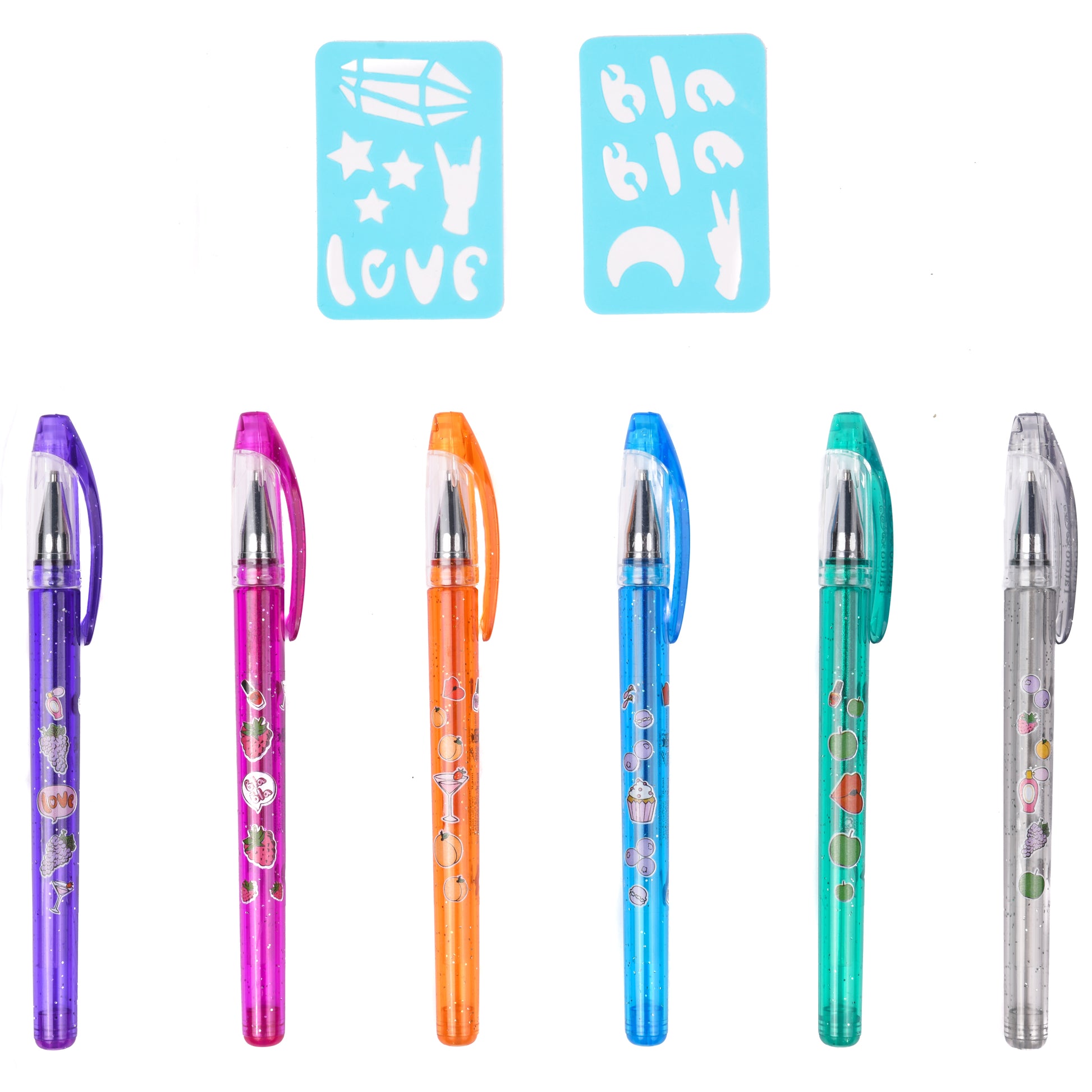 Verpakking met 6 gekleurde tattoo gelpennen. Hebben ook lichte glitters. Geleverd inclusief 2 sjablonen.